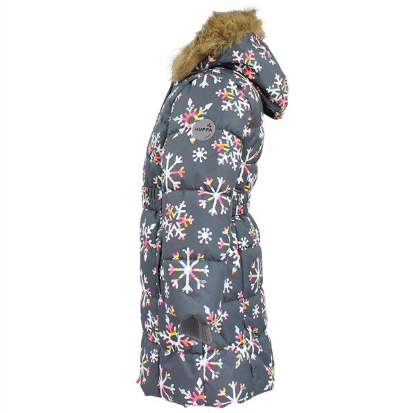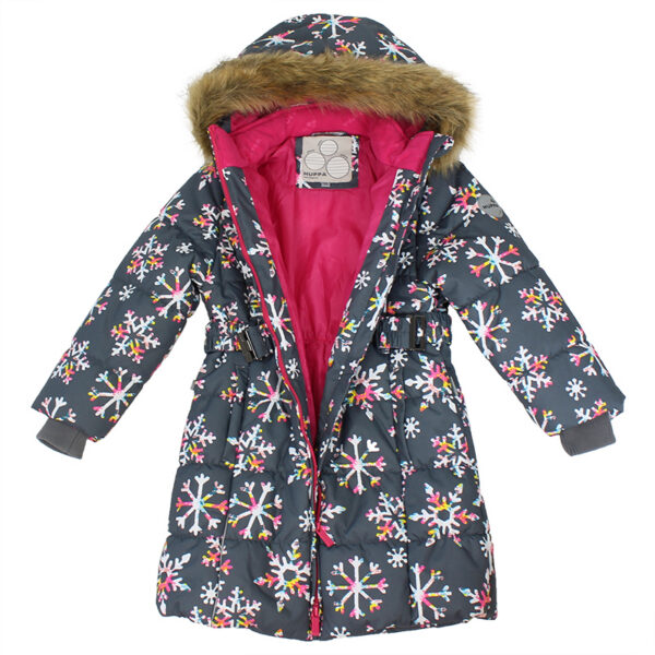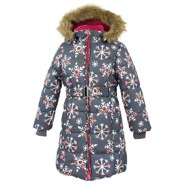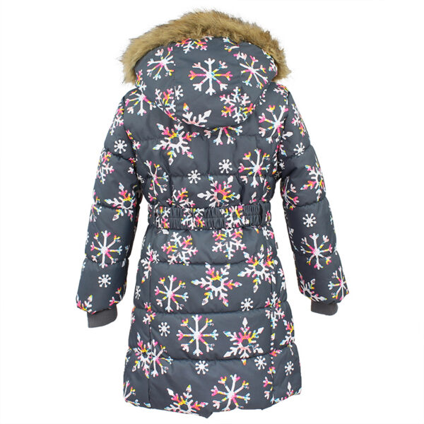 Children’s waterproof and windproof winter coat Breathable fabric Soft lining on the inside Removable snap-on hood Ribbed cuffs at sleeve ends Two-way zipper at front Faux fur trim on hood Reflective elements on fabric