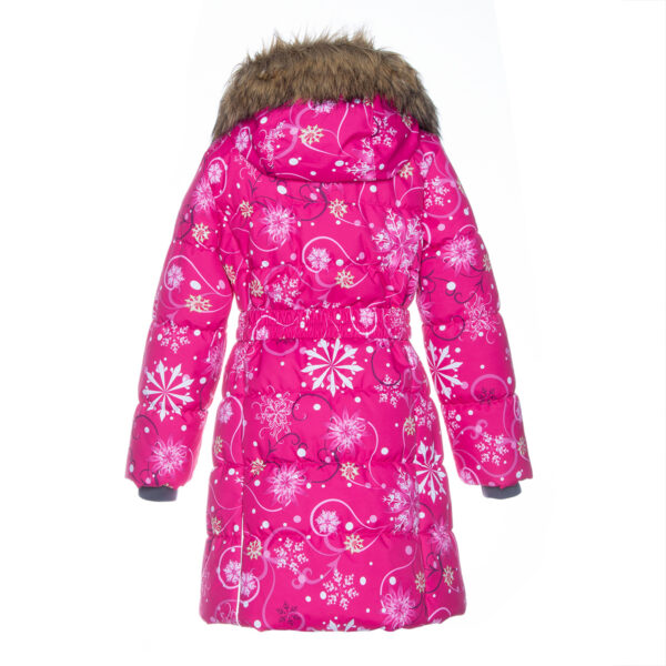 Children’s waterproof and windproof winter coat Breathable fabric Soft lining on the inside Removable snap-on hood Ribbed cuffs at sleeve ends Two-way zipper at front Faux fur trim on hood Reflective elements on fabric