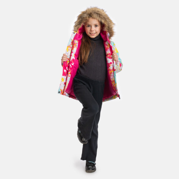 Girls’ 300g insulated winter jacket. The jacket has a soft flannel lining, and the outer fabric is both windproof and waterproof. Ribbed inner cuffs in the sleeves keep the child warm and dry even during active play. Reflective details added to the jacket ensure safety in the dark. The detachable hood with faux fur is safe for outdoor play, as it is attached with snap buttons to prevent snagging.