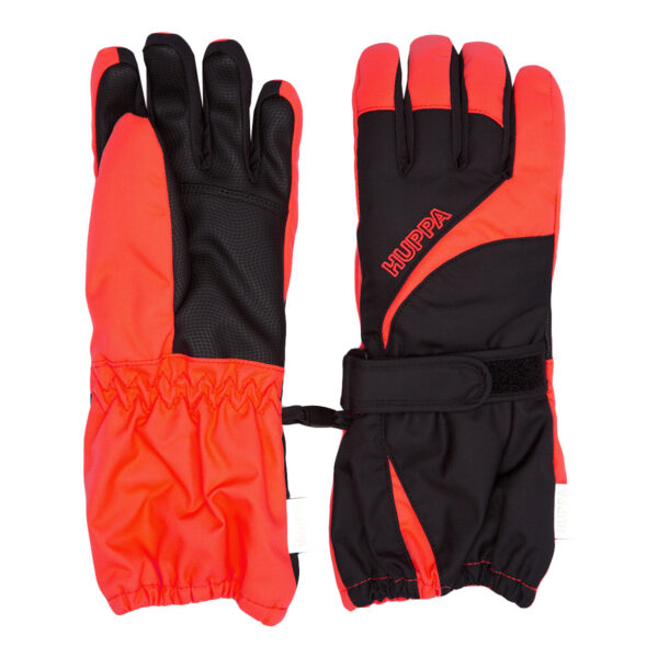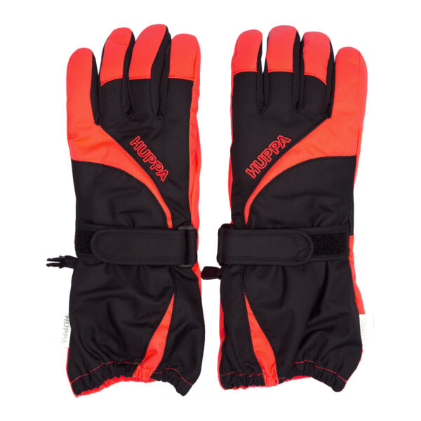 Adults’ waterproof and windproof gloves with lining. Breathable fabric. Comfortable integrated elastic band on wrist. Vecro adjusters on wrists. Soft fleece on the inside. A small clip keeps the gloves together. Reflective Huppa logo.