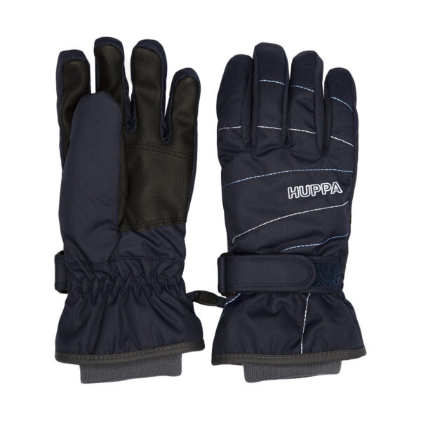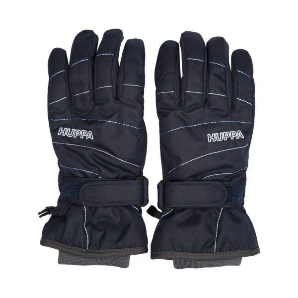Children´s waterproof and windproof lined gloves with 90 g insulation. Breathable outer fabric. Comfortable integrated elastic band and ribbed cuff at the wrist. Adjustable wrist with Velcro closure. The inside of the gloves is made of soft fleece fabric. Additional waterproof intermediate layer. A small clip closure helps keep the pair of gloves together. Reflective Huppa logo on the outer fabric.
