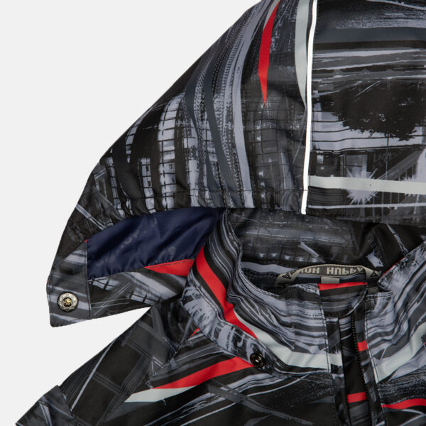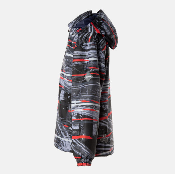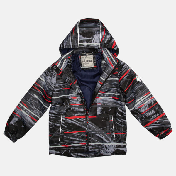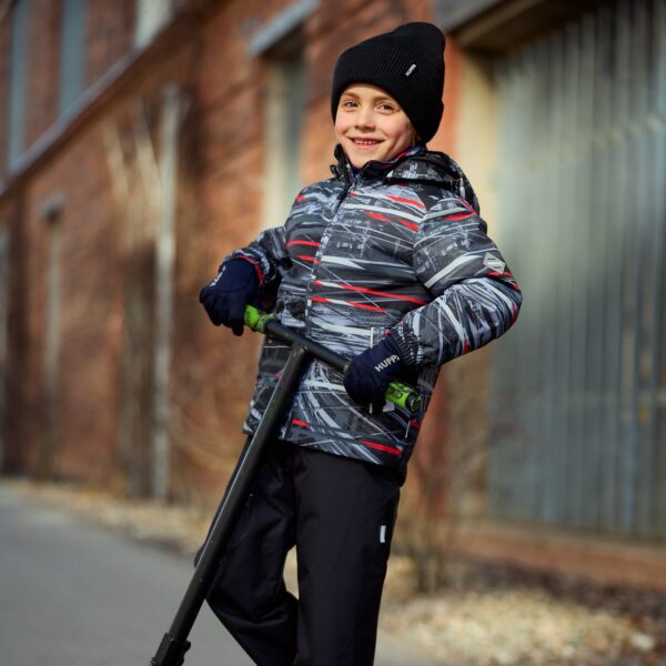 Insulated (100 g) water- and windproof between-seasons jacket for boys. The top layer of the jacket is made of a breathable material. The elasticated, detachable hood can be attached to the collar with snap fasteners. The jacket also has an elasticated waist and sleeve ends. It is decorated with reflective details.