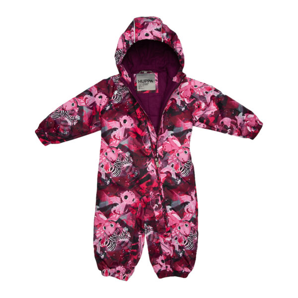 Insulated (40 g) water- and windproof overall for babies, suitable for spring and autumn. The top layer of the overall is made of a breathable material. The overall has flannel lining, sewn-in elastic bands on the sleeves, leg ends and hood. Overalls in sizes 62-80 have retractable hand and leg coverings. The overall has taped seams. The set includes elastic foot straps. It is decorated with reflective details.