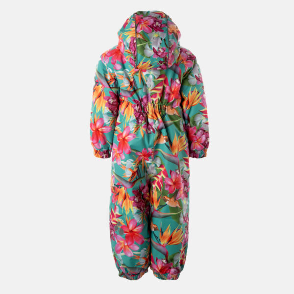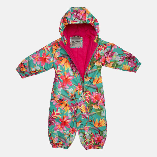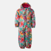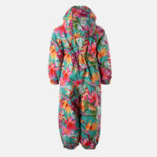 Insulated (40 g) water- and windproof overall for babies, suitable for spring and autumn. The top layer of the overall is made of a breathable material. The overall has flannel lining, sewn-in elastic bands on the sleeves, leg ends and hood. Overalls in sizes 62-80 have retractable hand and leg coverings. The overall has taped seams. The set includes elastic foot straps. It is decorated with reflective details.