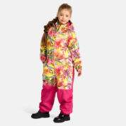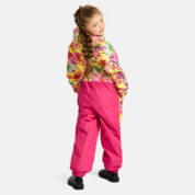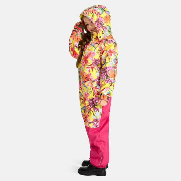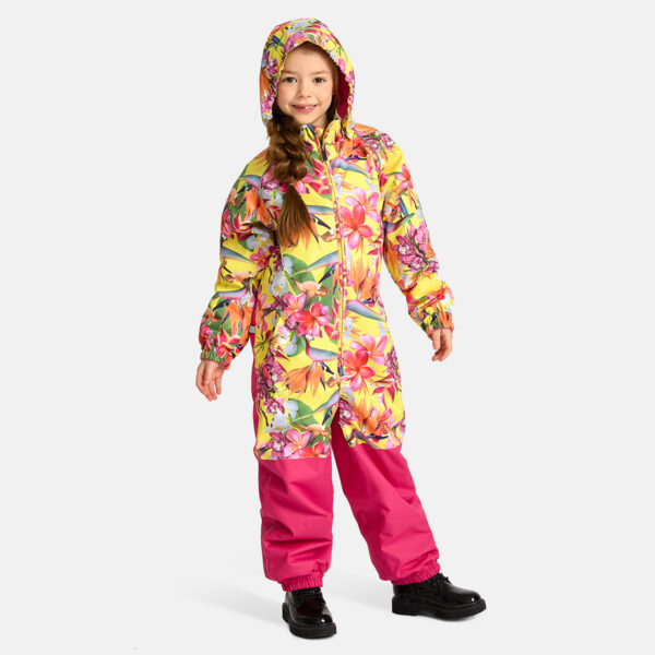 Insulated (40 g) water- and windproof overall for kids, suitable for spring and autumn. The top layer of the overall is made of a breathable material. It has sewn-in elastic bands on the sleeves, ankles and hood. The detachable hood can be attached to the collar with snap fasteners. The overall has a sewn-in buttonhole elastic on the waistline and waterproof, taped seams. The set includes elastic foot straps. It is decorated with reflective details.