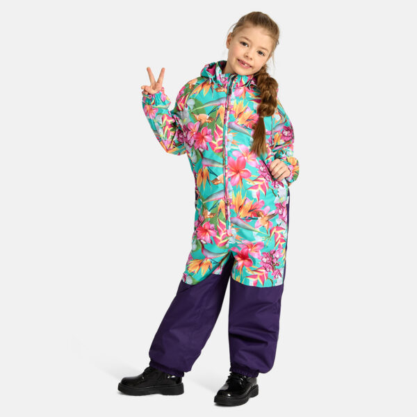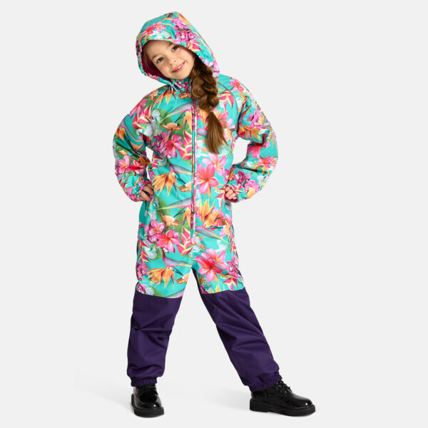 Insulated (40 g) water- and windproof overall for kids, suitable for spring and autumn. The top layer of the overall is made of a breathable material. It has sewn-in elastic bands on the sleeves, ankles and hood. The detachable hood can be attached to the collar with snap fasteners. The overall has a sewn-in buttonhole elastic on the waistline and waterproof, taped seams. The set includes elastic foot straps. It is decorated with reflective details.