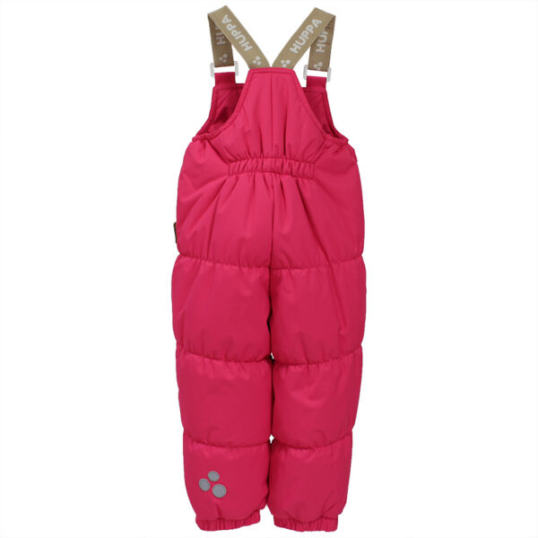 Children’s waterproof and windproof pants with 160 g lining. Breathable fabric. Soft lining fabric on the inside. The bib pants have elastic adjustable braces. Integrated elastic band on waist and at leg ends. Elastic foot straps. Reflective elements on fabric.