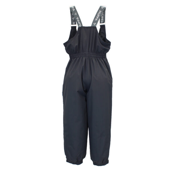 Children´s waterproof and windproof trousers. Breathable outer fabric. Inside of soft lining fabric. The trousers have a higher waist and adjustable elastic braces. Rubber band incorporated on the waistline and leg ends. Waterproof taped seat seam. The pants have no inseam on the leg. Reflective details on the outer fabric.