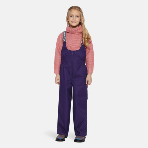 Children´s high-waisted trousers. The trousers are waterproof and windproof. Breathable outer fabric. The inside of the trousers is made of soft lining fabric. Adjustable elastic braces. incorporated rubber waistband. Rubber band tunnel with stoppers at the ends of the legs. Waterproof taped seat seam. The pants have no inseam on the leg. Reflective details on the outer fabric.