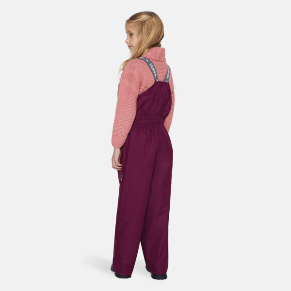 Children´s high-waisted trousers. The trousers are waterproof and windproof. Breathable outer fabric. The inside of the trousers is made of soft lining fabric. Adjustable elastic braces. incorporated rubber waistband. Rubber band tunnel with stoppers at the ends of the legs. Waterproof taped seat seam. The pants have no inseam on the leg. Reflective details on the outer fabric.