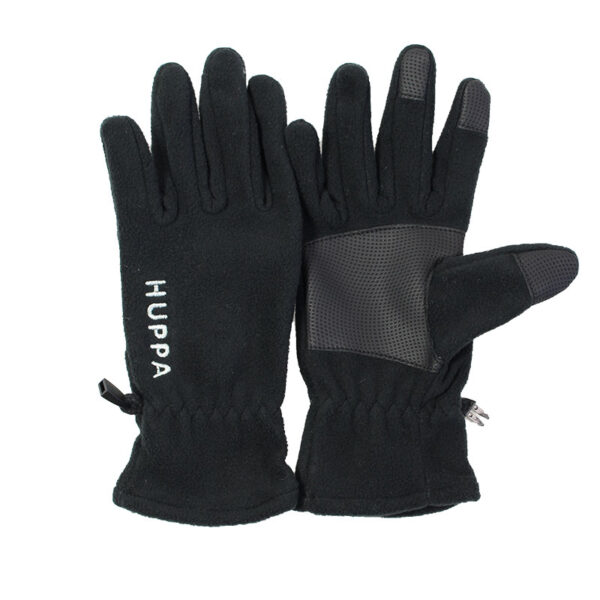Children’s soft fleece gloves. Comfortable integrated elastic band on wrist. Non-slip elements in palm and on fingertips. A small clip keeps the gloves together between uses.