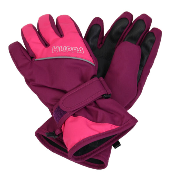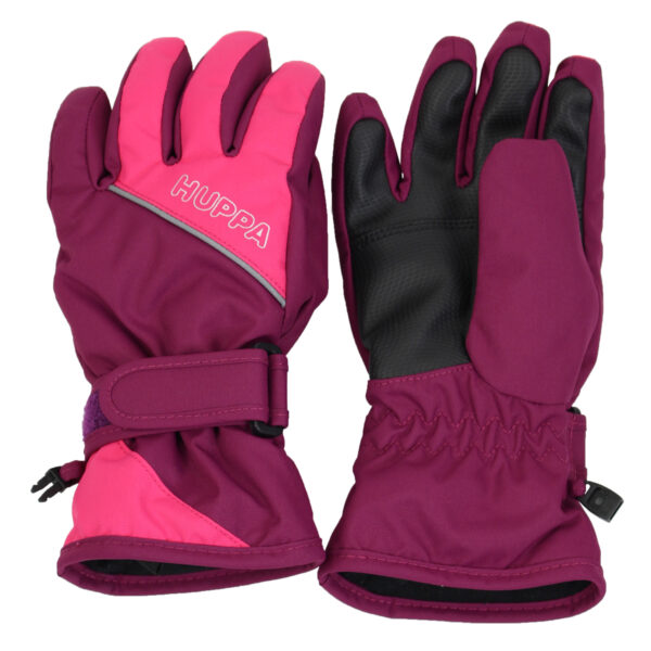 Vaikiškos neperšlampamos ir neperpučiamos pirštuotos pirštinės su pamušalu. Orui laidi išorinė medžiaga. Ant riešo įsiūta patogi guminė juostelė. Rankogaliai reguliuojami kibiu užsegimu. Pirštinių vidinė pusė iš minkšto flisinio audinio. Pirštinių porą galima susegti mažu segtuku. Viršutinis audinys su šviesą atspindinčiomis detalėmis.
