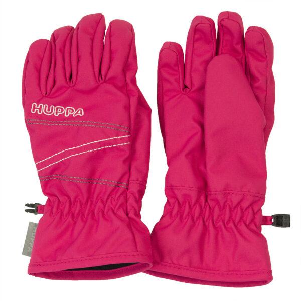Waterproof and windproof gloves for adults. Breathable outer fabric. Comfortable incorporated rubber band on the wrist. The inside of the mittens is made of soft fleece fabric. A small clip helps keep the pair of gloves together. Huppa reflective logo on the outer fabric.