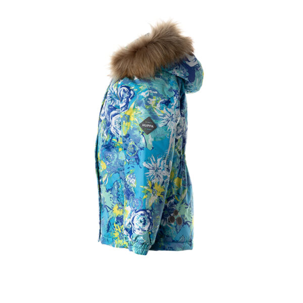 Children’s waterproof and windproof jacket. Breathable fabric. Soft mesh lining on the inside. Removable snap-on hood. Integrated elastic band at sleeve ends and on the waist. Zipper covered with stud-press flap at front. Integrated pockets at front. Faux fur trim on hood. Reflective elements on fabric.