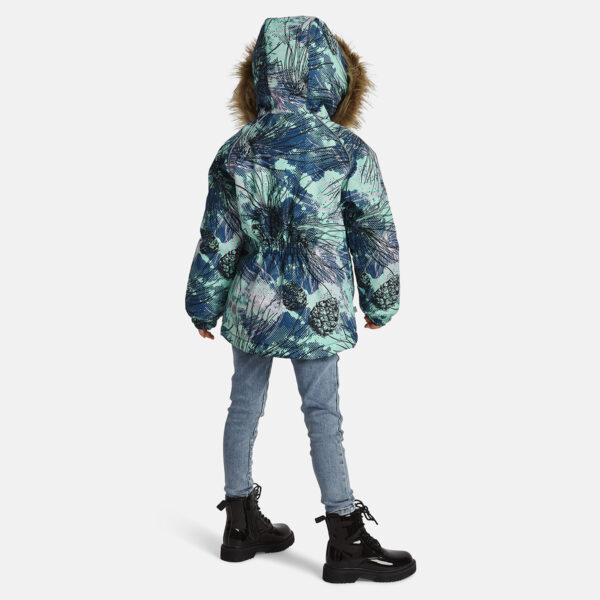 Children’s waterproof and windproof jacket. Breathable fabric. Soft mesh lining on the inside. Removable snap-on hood. Integrated elastic band at sleeve ends and on the waist. Zipper covered with stud-press flap at front. Integrated pockets at front. Faux fur trim on hood. Reflective elements on fabric.