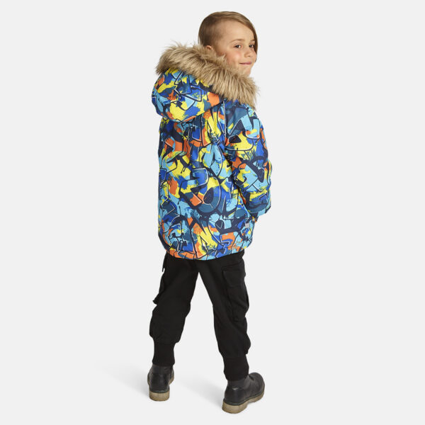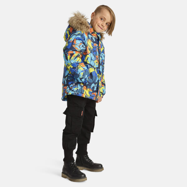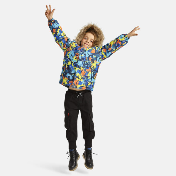 Children’s waterproof and windproof jacket. Breathable fabric. Soft mesh lining on the inside. Removable snap-on hood. Integrated elastic band at sleeve ends. Zipper covered with stud-press flap at front. Integrated pockets at front. Faux fur trim on hood. Reflective elements on fabric.