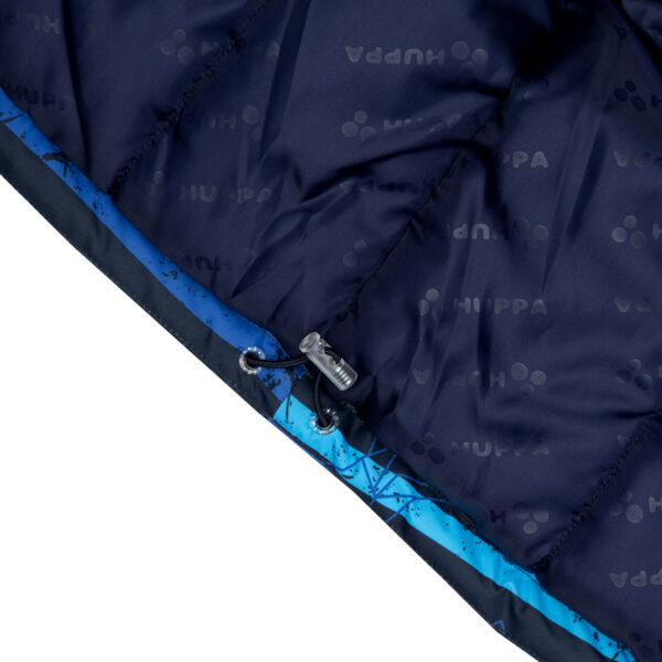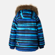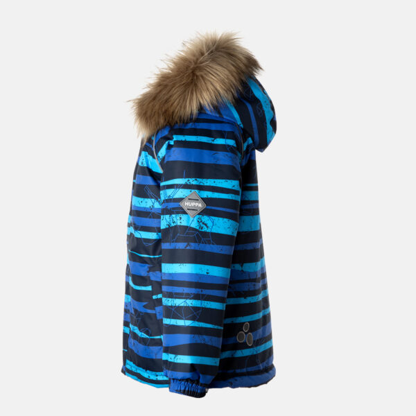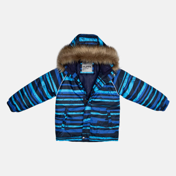 Children’s waterproof and windproof jacket. Breathable fabric. Soft mesh lining on the inside. Removable snap-on hood Integrated elastic band at sleeve ends. Zipper covered with stud-press flap at front. Integrated pockets at front. Faux fur trim on hood. Reflective elements on fabric.