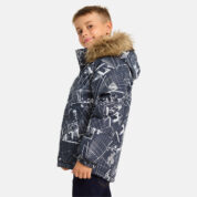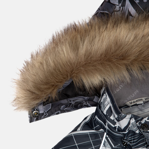 Children’s waterproof and windproof jacket. Breathable fabric. Soft mesh lining on the inside. Removable snap-on hood Integrated elastic band at sleeve ends. Zipper covered with stud-press flap at front. Integrated pockets at front. Faux fur trim on hood. Reflective elements on fabric.