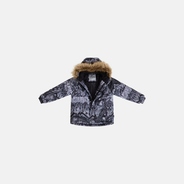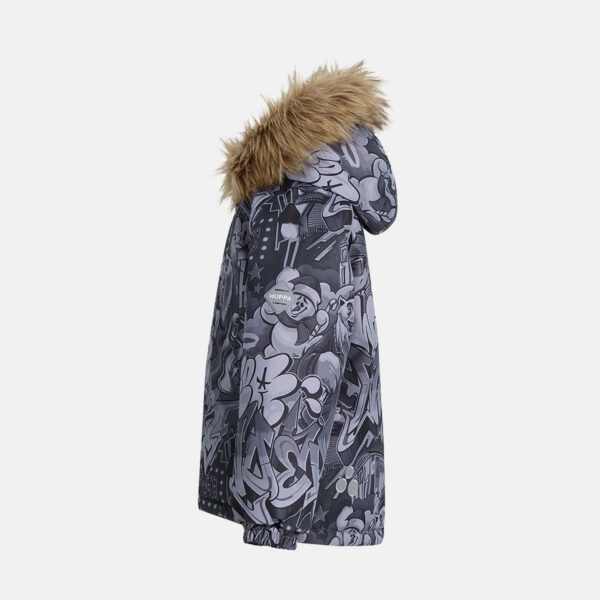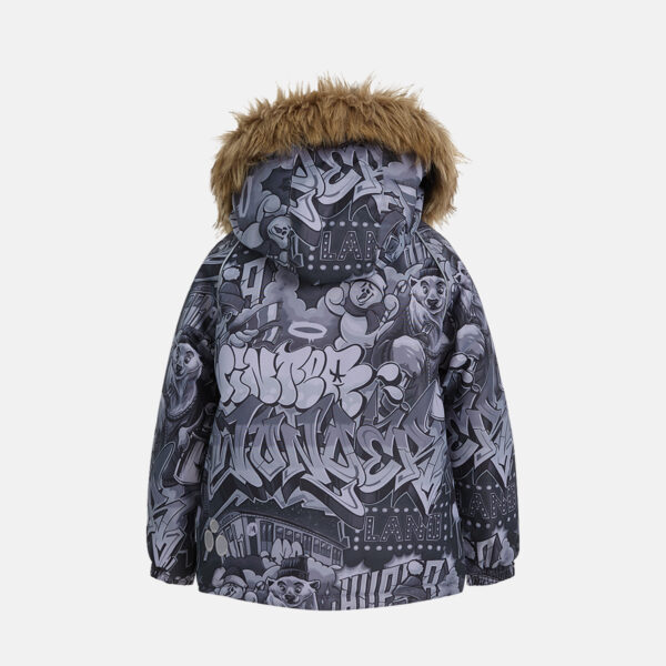 Children’s waterproof and windproof jacket. Breathable fabric. Soft mesh lining on the inside. Removable snap-on hood Integrated elastic band at sleeve ends. Zipper covered with stud-press flap at front. Integrated pockets at front. Faux fur trim on hood. Reflective elements on fabric.