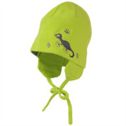 A thinner knitted spring-autumn hat for toddlers. The simple-cut hat is knitted from a 60% cotton, 40% acrylic yarn blend and the lining is soft cotton jersey. The hat is decorated with cute embroidery. For more comfortable wearing, the hat has earflaps and tying laces.