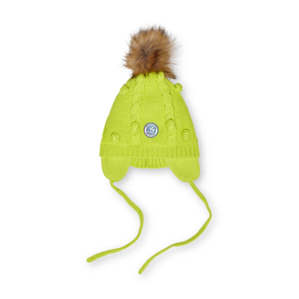 Children´s winter knitted hat. The lining of the hat is made of cotton jersey and the top is made of acrylic yarn. For more comfortable wearing, the hat has laces and small flaps that protect the ears.