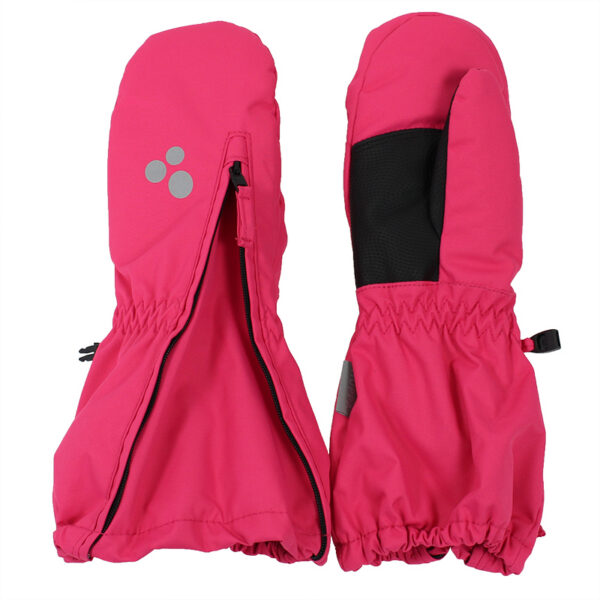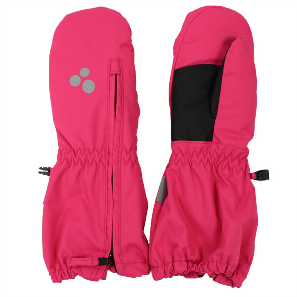 Children’s waterproof and windproof mittens with lining. Breathable fabric. Integrated elastic band on wrist and at bottom. With zipper. Soft fleece on the inside. A small clip keeps the mittens together. Reflective Huppa elements.