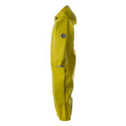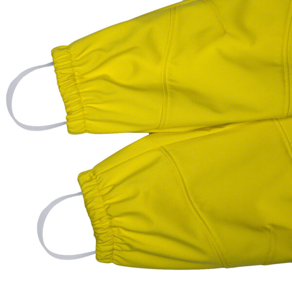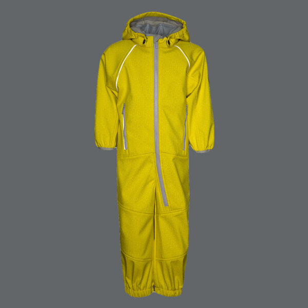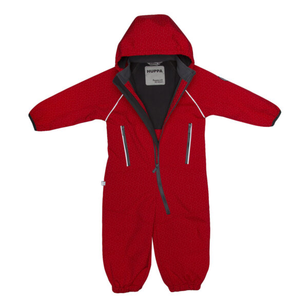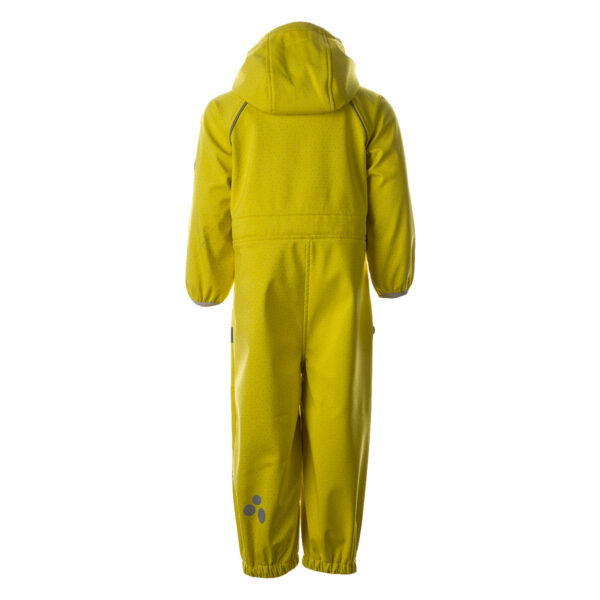Children´s Softshell windproof overalls. Dotted reflective print on the outer side. The overalls have a soft inner side. Rubber band incorporated at the ends of the sleeves and legs and at the edge of the hood. The removable hood attaches to the collar with press studs. Pockets with integrated zipper in the front piece. Rubber band incorporated in the waste on the back. Removable rubber soles.