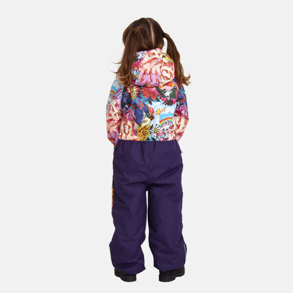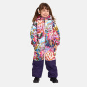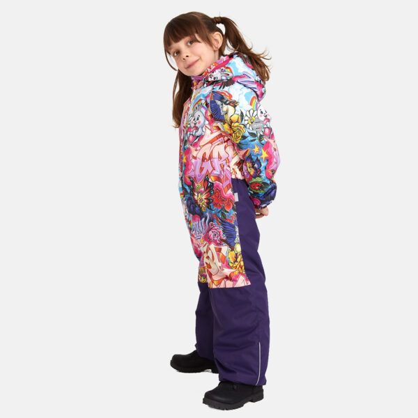 Insulated (100 g) water- and windproof between-seasons overall for kids. The outer fabric is breathable. Sewn-in elastic bands on the sleeves, ankles and hood. The detachable hood can be attached to the collar with snap-buttons. The overall has a sewn-in buttonhole elastic on the waistline. Waterproof taped seams. The set includes elastic foot straps. The outer fabric is decorated with reflective details.