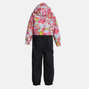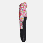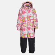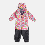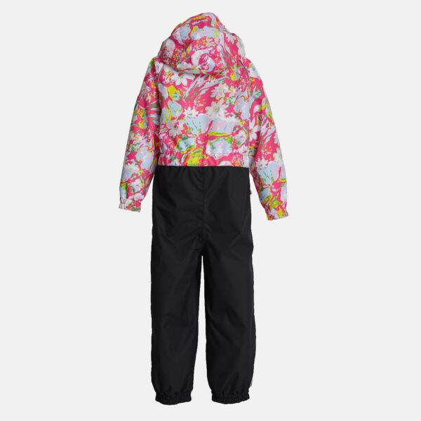 Insulated (40 g) water- and windproof overall for kids, suitable for spring and autumn. The top layer of the overall is made of a breathable material. It has sewn-in elastic bands on the sleeves, ankles and hood. The detachable hood can be attached to the collar with snap fasteners. The overall has a sewn-in buttonhole elastic on the waistline and waterproof, taped seams. The set includes elastic foot straps. It is decorated with reflective details.