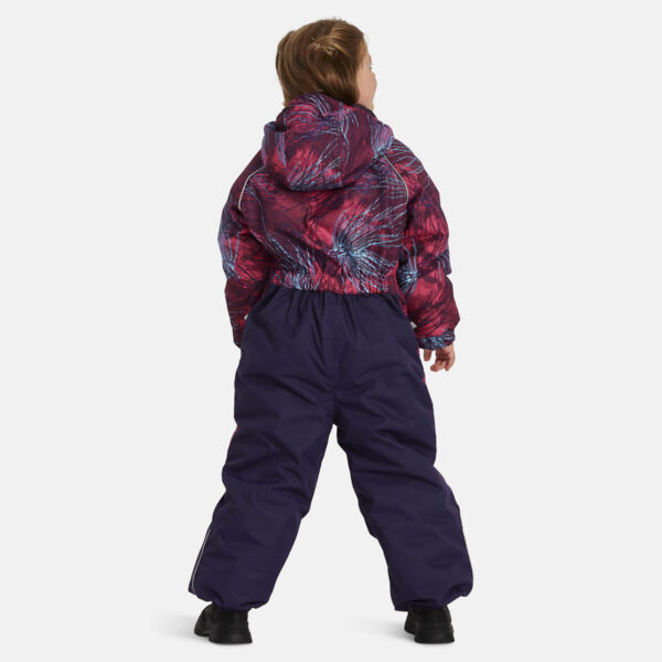 Bērnu ūdens un vēja necaurlaidīgs kombinezons Gaisu caurlaidīgs virsējais audums Kombinezonam mīksta flaneļa odere Piedurknēs, staru un kapuces malās iestrādāta gumijas apdare Noņemamā kapuce pie apkakles stiprināma ar velkro aizdari Priekšpusē apšūtas kabatas Ūdens necaurlaidīgi līmēti izšuvumi Komplektā elastīgas pazolītes Auduma virspusē atstarojošas detaļas