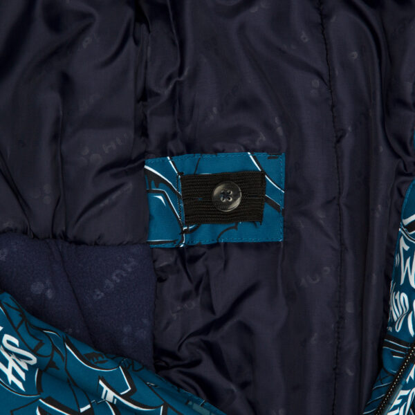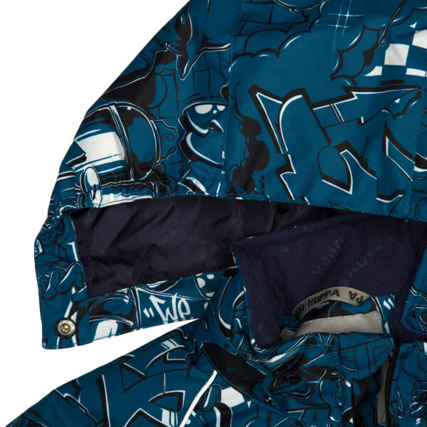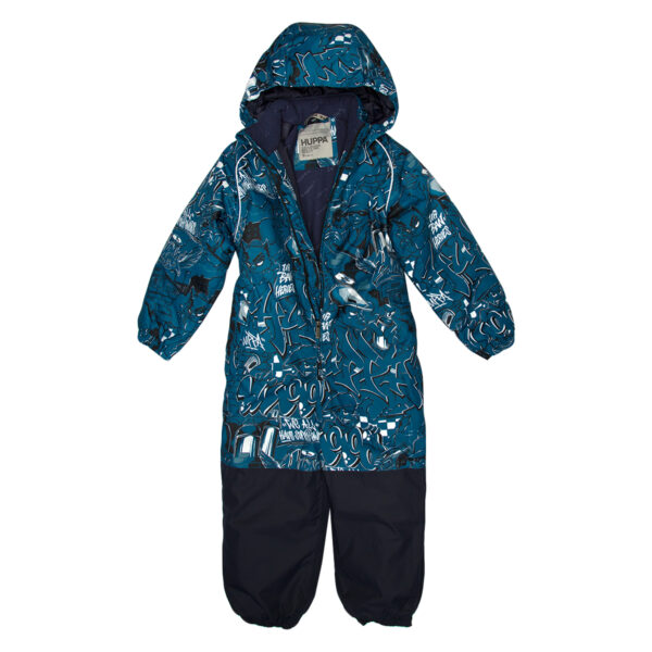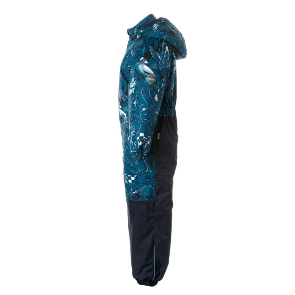 Bērnu ūdens un vēja necaurlaidīgs kombinezons Gaisu caurlaidīgs virsējais audums Kombinezonam mīksta flaneļa odere Piedurknēs, staru un kapuces malās iestrādāta gumijas apdare Noņemamā kapuce pie apkakles stiprināma ar velkro aizdari Priekšpusē apšūtas kabatas Ūdens necaurlaidīgi līmēti izšuvumi Komplektā elastīgas pazolītes Auduma virspusē atstarojošas detaļas