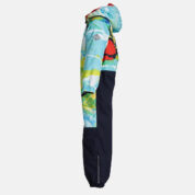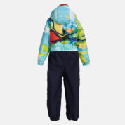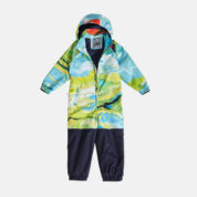 Insulated (40 g) water- and windproof overall for kids, suitable for spring and autumn. The top layer of the overall is made of a breathable material. It has sewn-in elastic bands on the sleeves, ankles and hood. The detachable hood can be attached to the collar with snap fasteners. The overall has a sewn-in buttonhole elastic on the waistline and waterproof, taped seams. The set includes elastic foot straps. It is decorated with reflective details.