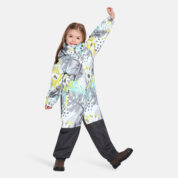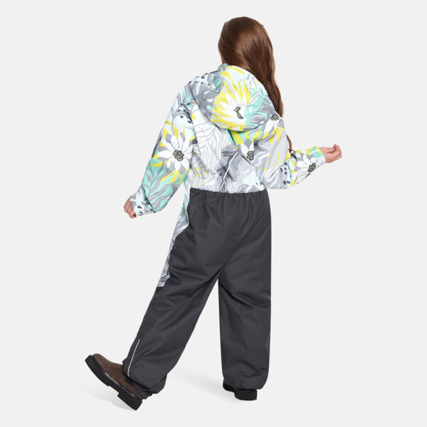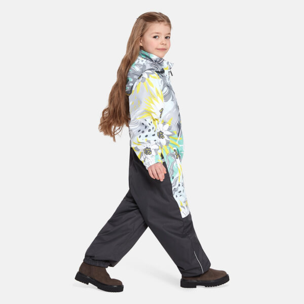 Insulated (40 g) water- and windproof overall for kids, suitable for spring and autumn. The top layer of the overall is made of a breathable material. It has sewn-in elastic bands on the sleeves, ankles and hood. The detachable hood can be attached to the collar with snap fasteners. The overall has a sewn-in buttonhole elastic on the waistline and waterproof, taped seams. The set includes elastic foot straps. It is decorated with reflective details.