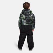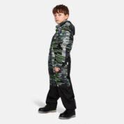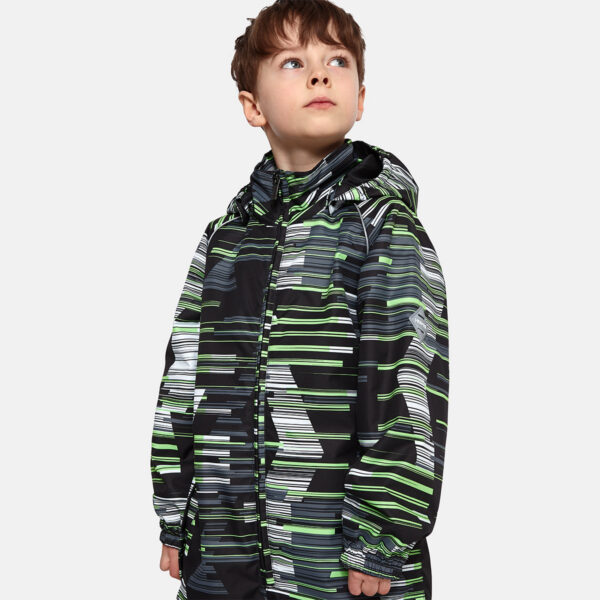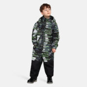 Insulated (40 g) water- and windproof overall for kids, suitable for spring and autumn. The top layer of the overall is made of a breathable material. It has sewn-in elastic bands on the sleeves, ankles and hood. The detachable hood can be attached to the collar with snap fasteners. The overall has a sewn-in buttonhole elastic on the waistline and waterproof, taped seams. The set includes elastic foot straps. It is decorated with reflective details.