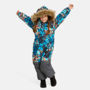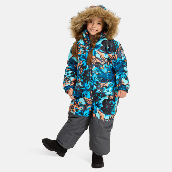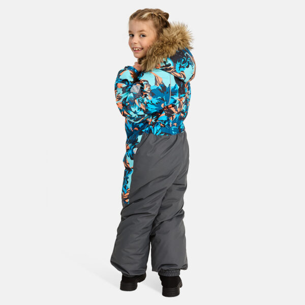 Children’s water- and windproof snowsuit with 200 g insulation. Breathable outer fabric. Soft fabric on the inside of the snowsuit. Elastic cuffs of sleeve and leg ends, plus hood with elastic edging. Detachable hood fastens to the collar with snap buttons. Elastic waistband with buttonholes. Waterproof taped seams. The product comes with elastic stirrups. Reflective detailing on outer fabric.