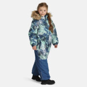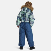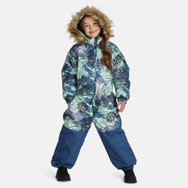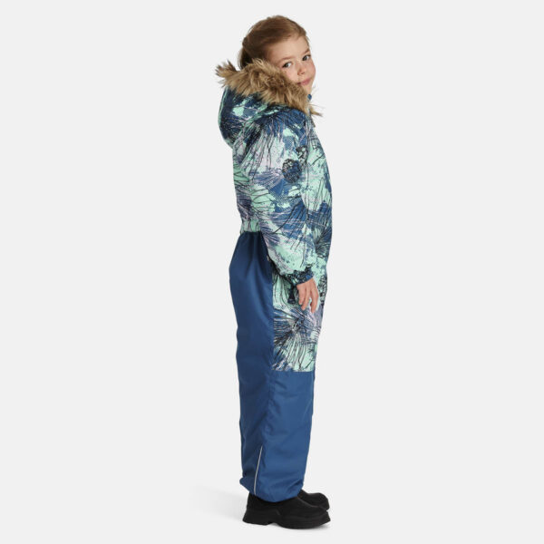 Children’s waterproof and windproof overall Breathable fabric Soft fabric on the inside Integrated elastic band at sleeve and leg ends Removable snap-on hood Integrated zipper pocket at front Waterproof taped seams Elastic foot straps Removable faux fur trim on hood Reflective elements on fabric