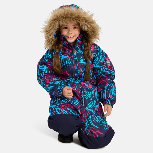 Children’s waterproof and windproof overall. Breathable fabric. Soft fabric on the inside. Integrated elastic band at sleeve and leg ends. Removable snap-on hood. Integrated zipper pocket at front. Waterproof taped seams. Elastic foot straps. Removable faux fur trim on hood. Reflective elements on fabric.