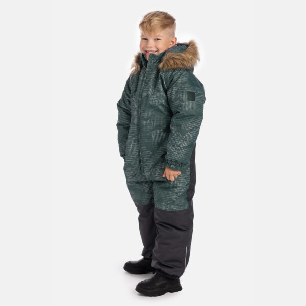 Children’s waterproof and windproof overall. Breathable fabric. Soft fabric on the inside. Integrated elastic band at sleeve and leg ends. Removable snap-on hood. Integrated zipper pocket at front. Waterproof taped seams. Elastic foot straps. Removable faux fur trim on hood. Reflective elements on fabric.