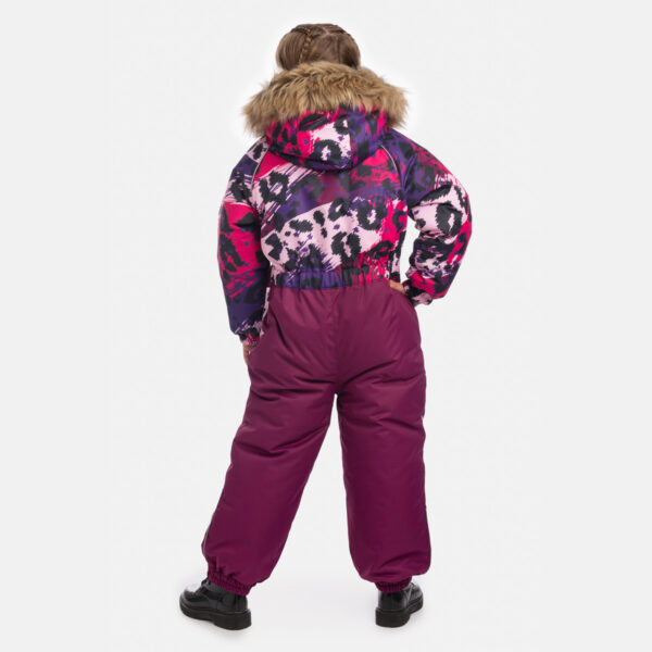 Children’s waterproof and windproof overall. Breathable fabric. Soft fabric on the inside. Integrated elastic band at sleeve and leg ends. Removable snap-on hood. Integrated zipper pocket at front. Waterproof taped seams. Elastic foot straps. Removable faux fur trim on hood. Reflective elements on fabric.