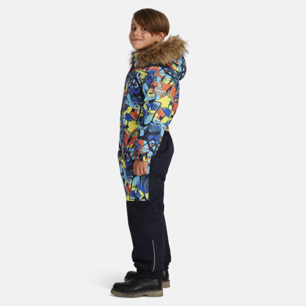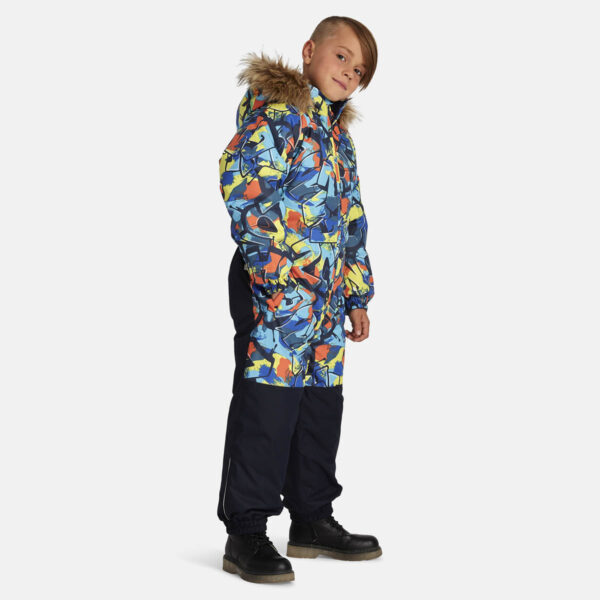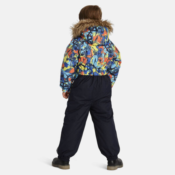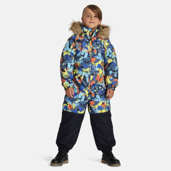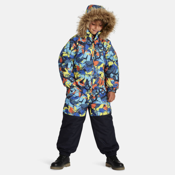 Bērnu ūdens un vēja necaurlaidīgs kombinezons. Gaisu caurlaidīgs virsējais audums. Kombinezonam mīksta odere. Piedurknēs un staru malās iestrādāta gumijas apdare. Noņemamā kapuce pie apkakles stiprināma ar velkro aizdari. Ūdens necaurlaidīgi līmēti izšuvumi. Komplektā elastīgas pazolītes. Auduma virspusē atstarojošas detaļas.