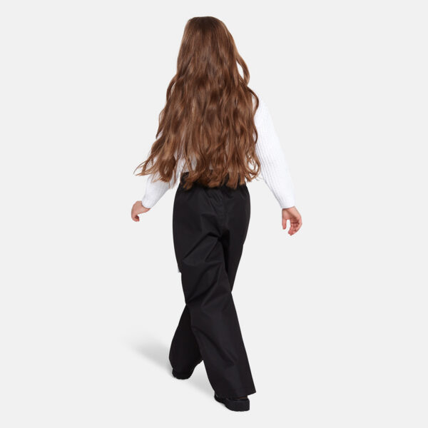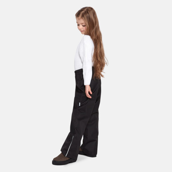 Kids’ pants for spring and autumn. The pants are water- and windproof. The top layer of the pants is made of a breathable material, while the inside is lined with a soft fabric. The pants have a wide sewn-in elastic band on the waist and a waterproof taped crotch seam. The pants are decorated with reflective details.