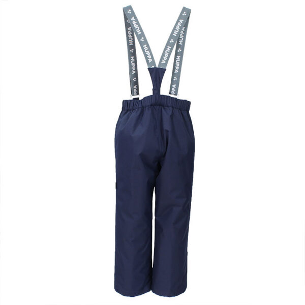Children´s trousers. The trousers are waterproof and windproof. Breathable outer fabric. The inside of the trousers is made of soft lining fabric. Removable adjustable elastic braces. A wide rubber band is incorporated into the waist. Rubber band tunnel with stoppers at the ends of the legs. Waterproof taped seat seam. Reflective details on the outer fabric.