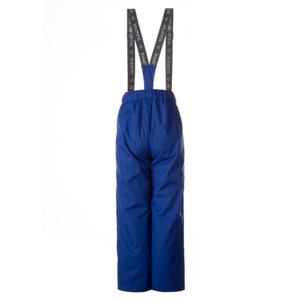 Children´s trousers. The trousers are waterproof and windproof. Breathable outer fabric. The inside of the trousers is made of soft lining fabric. Removable adjustable elastic braces. A wide rubber band is incorporated into the waist. Rubber band tunnel with stoppers at the ends of the legs. Waterproof taped seat seam. Reflective details on the outer fabric.