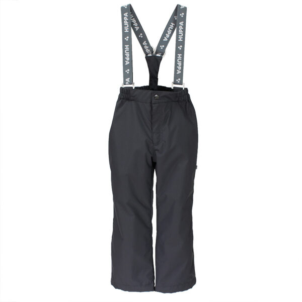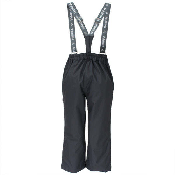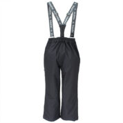 Children´s trousers. The trousers are waterproof and windproof. Breathable outer fabric. The inside of the trousers is made of soft lining fabric. Removable adjustable elastic braces. A wide rubber band is incorporated into the waist. Rubber band tunnel with stoppers at the ends of the legs. Waterproof taped seat seam. Reflective details on the outer fabric.