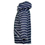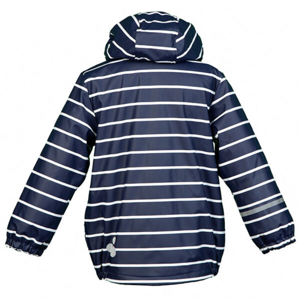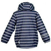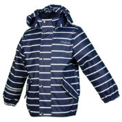 Children’s windproof rain jacket. Soft mesh lining on the inside. Integrated elastic band at sleeve ends and around hood. Removable snap-on hood. Taped seams to keep the jacket dry. Reflective elements on fabric.