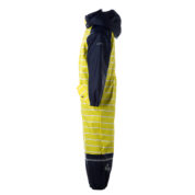 Kids´ water- and windproof rain overall. The inner lining of the overall is made of a soft fleece material. It has sewn-in elastic bands on the sleeves, ankles and hood. The detachable hood can be attached to the collar with snap fasteners. Welded seams keep the overall dry. The set includes elastic foot straps. It is decorated with reflective details.