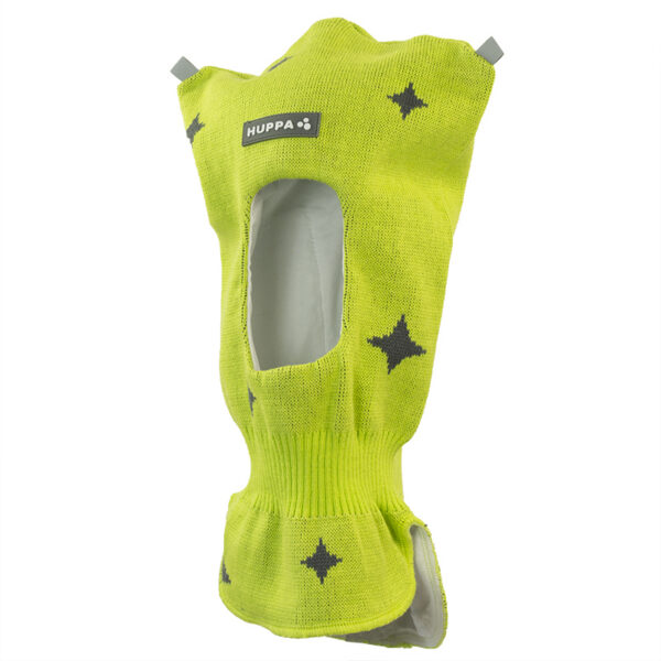 Children´s scarf hat knitted from cotton blend yarn. The inside of the hat is made of cotton knitted fabric. Reflective details on the hat.