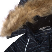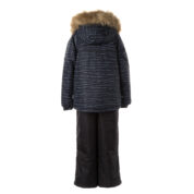 Bērnu jakas un bikšu komplekts. Ūdens un vēja necaurlaidīgs, gaisu caurlaidīgs virsējais audums. Jakai un biksēm ir mīksta odere. Piedurkņu un muguras daļā iestrādāta gumijas apdare. Noņemamā kapuce pie apkakles stiprināma ar velkro aizdari. Kapucei mākslīgās kažokādas malai. Biksēm ir augstais viduklis un regulējamas elastīgās lences. Jostas daļā iestrādāts gumijas paliktnis. Staras aizdarāmas ar stoperi. Ūdens necaurlaidīgi līmēti izšuvumi. Biksēm trūkst iekšējais staru apšuvums. Kā jakai, tā arī biksēm ir atstarojošas detaļas.