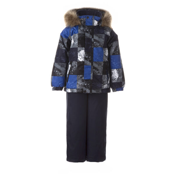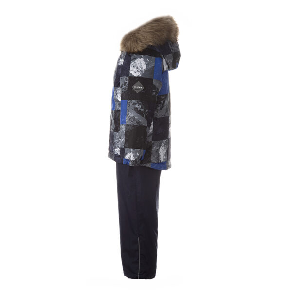 Children’s jacket and pants set. Waterproof, windproof and breathable fabric. Soft lining on the inside of the jacket and pants. Integrated elastic band at sleeve ends and on the waist. Removable snap-on hood. Faux fur trim on hood. The bib-pants have elastic adjustable suspenders. Integrated elastic band on waist. Drawstring tunnel with stoppers at leg ends. Waterproof taped seams. The pants have no inner leg seam. Reflective details on both jacket and pants.