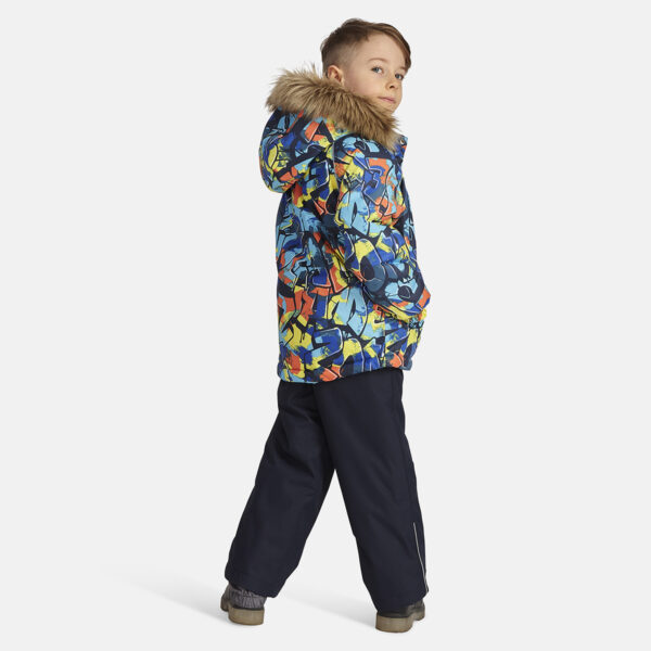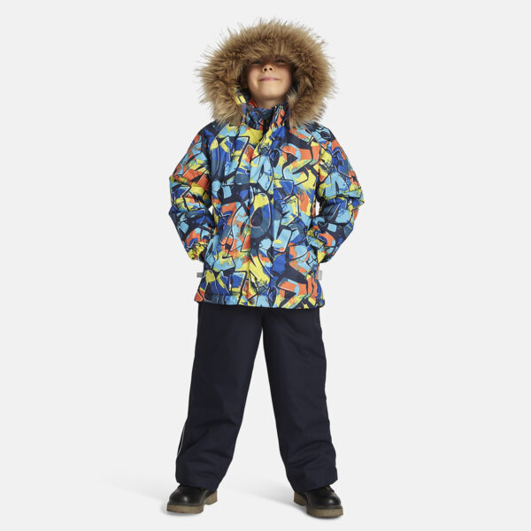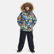 Bērnu jakas un bikšu komplekts. Ūdens un vēja necaurlaidīgs, gaisu caurlaidīgs virsējais audums. Jakai un biksēm ir mīksta odere. Piedurkņu un muguras daļā iestrādāta gumijas apdare. Noņemamā kapuce pie apkakles stiprināma ar velkro aizdari. Kapucei mākslīgās kažokādas malai. Biksēm ir augstais viduklis un regulējamas elastīgās lences. Jostas daļā iestrādāts gumijas paliktnis. Staras aizdarāmas ar stoperi. Ūdens necaurlaidīgi līmēti izšuvumi. Biksēm trūkst iekšējais staru apšuvums. Kā jakai, tā arī biksēm ir atstarojošas detaļas.